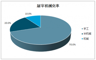 屠宰頭部企業(yè)的屠宰量及屠宰機(jī)械化率水平仍有待提高。目前我國(guó)屠宰行業(yè)的機(jī)械化處理生豬的比例僅為10%,半機(jī)械半手工方式占比為20%,仍有70%左右的生豬屠宰依靠手工方式處理,處理機(jī)械化率較低。