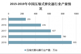 2015年我國壓縮式霧化器行業(yè)產(chǎn)量約255萬臺,到2019年增長到了935萬臺。