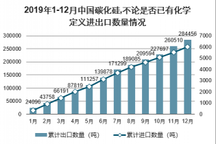 2019年1-12月中國(guó)碳化硅,不論是否已有化學(xué)定義,進(jìn)口數(shù)量為5993噸,同比增長(zhǎng)34.7%; 2019年1-12月中國(guó)碳化硅,不論是否已有化學(xué)定義,出口數(shù)量為284456噸,同比下降23.7%。