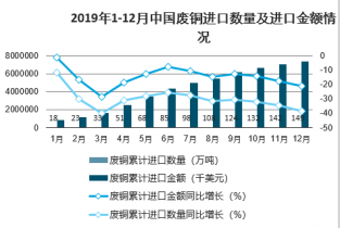 2019年1-12月中國廢銅進口數量為149萬噸,同比下降38.4%;2019年1-12月中國廢銅進口金額為7374672千美元,同比下降21%。