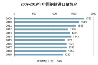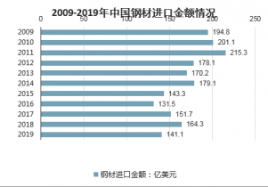 從出口方面看,2009-2015年鋼材出口量持續(xù)上漲,2016年隨著國家供給側改革的實施,鋼材出口量首次下跌。2019年中國出口鋼材6429萬噸,同比下降7.3%,鋼材出口金額537.6億美元,同比下降11.3%。進口方面,2019年鋼材進口1230萬噸,同比下降6.6%,進口金額141.1億美元,同比下降14.1%。