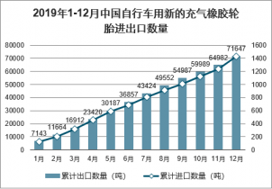 2019年1-12月中國自行車用新的充氣橡膠輪胎進(jìn)口數(shù)量為1433噸,同比下降24.4%;22019年1-12月中國自行車用新的充氣橡膠輪胎出口數(shù)量為71647噸,同比下降2%;