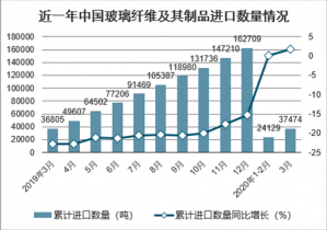 2020年1-3月中國玻璃纖維及其制品進(jìn)口數(shù)量為37474噸,同比增長1.8%。