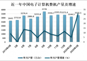 2020年4月中國電子計算機整機產(chǎn)量為3325.1萬臺,同比增長31%;2020年1-4月中國電子計算機整機產(chǎn)量為9347.4萬臺,同比下降3.2%。