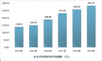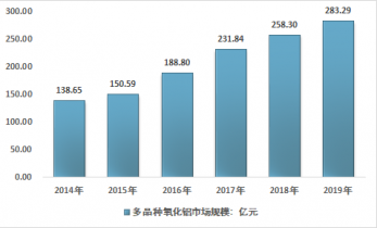 近幾年,我國多品種氧化鋁市場規(guī)模快速增長,從2014年的138.65億元增長到了2019年的283.29億元。