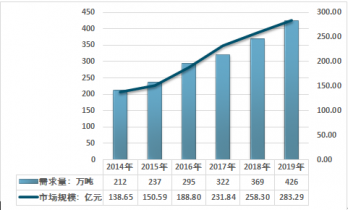 2014-2019年我國多品種氧化鋁需求量及市場規(guī)模走勢圖