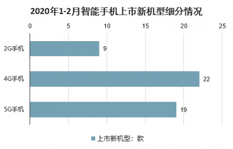 數(shù)據(jù)顯示,在2020年1-2月里,上市新機(jī)型50款,同比下降31.5%;智能手機(jī)上市新機(jī)型40款,同比下降31.0%,占同期上市新機(jī)型數(shù)量的80.0%;其中2G手機(jī)9款、4G手機(jī)22款、5G手機(jī)19款。