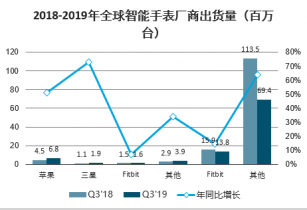 2018-2019年全球智能手表廠商出貨量(百萬臺(tái))