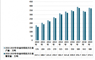 2019年我國中藥飲片行業(yè)產(chǎn)量380萬噸,國內(nèi)中藥飲片行業(yè)需求量373.5萬噸。
