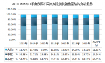 2013-2020年1季度我國(guó)不同類別挖掘機(jī)銷售量結(jié)構(gòu)變動(dòng)趨勢(shì)