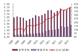《2012-2016年中國智能手機產(chǎn)業(yè)競爭態(tài)勢與投資前景研究報告》指出:根據(jù)創(chuàng)新產(chǎn)品擴散理論,新產(chǎn)品在滲透率達(dá)到50%以前,其使用者主要為相對高端用戶。2012年3季度,全球智能手機出貨量為1.80億部,同比增長45.3%,在全部手機中的滲透率達(dá)到40.43%。因而可以預(yù)測2013年高端智能手機市場將逐步飽和,該領(lǐng)域未來增量主要來自于換機需求。