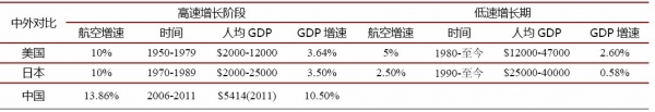 航空業(yè)的發(fā)展與宏觀經(jīng)濟密切相關(guān),國內(nèi)經(jīng)濟增長整體雖有下移,但穩(wěn)增長依然是主流趨勢。《2012-2016年中國航空制造市場調(diào)研與投資戰(zhàn)略研究報告》顯示:2011年國內(nèi)航空RPK增速為12.33%,2012年1-10月增速依然保持10.98%,增長依舊強勁。從發(fā)展趨勢來看,參考美日航空業(yè)的發(fā)展軌跡,我們發(fā)現(xiàn),隨著人均GDP與航空需求保持同步增長,其中在人均GDP達到10000美元之前,航空需求的增速保持快速增長,復合增速達到10%以上;弼人均GDP達到10000美元甚至25000美元以上時,航空增速開始放緩,復合增速在2-5%之間。從時間跨度來看,高速增長的時間段有長有短,跨度較大的可以保持30年以上,短的也可以維持20年。