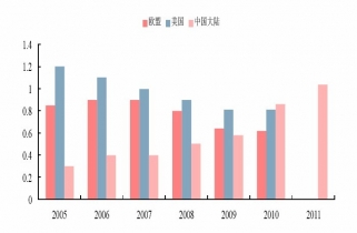 2005-2011年歐盟、美國和中國大陸人均混凝土用量