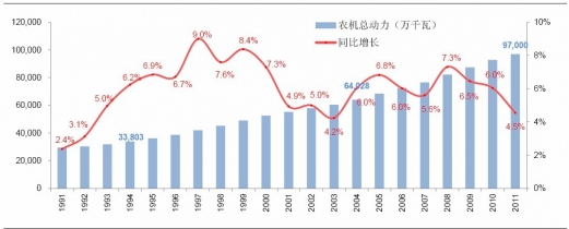 1991-2011年中國農(nóng)機(jī)總動力的增長情況
