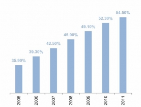 2005-2011年中國農(nóng)作物綜合機(jī)械化率變化情況