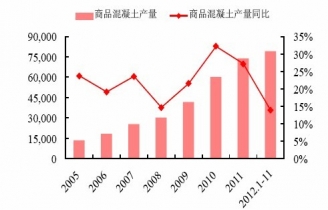 2005-2012年中國(guó)商品混凝土產(chǎn)量及其增速
