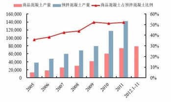 2005-2012年中國(guó)商品混凝土和預(yù)拌混凝土產(chǎn)量及其比例
