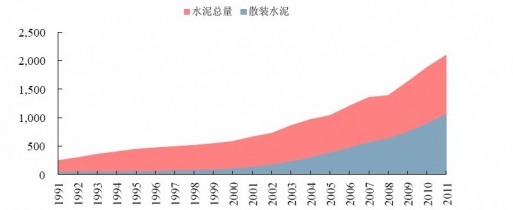 1991-2011年中國(guó)水泥總產(chǎn)量和散裝水泥用量