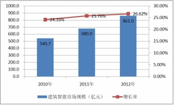 2010-2012年中國建筑智能市場規(guī)模及增速