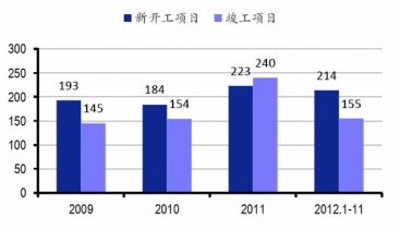 2009-2012年輪胎行業(yè)新開工項(xiàng)目與竣工項(xiàng)目數(shù)量