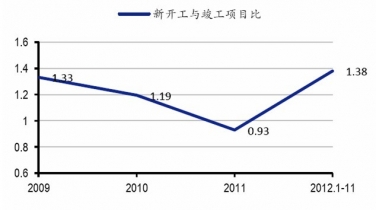 2009-2012年輪胎行業(yè)新開工項(xiàng)目與竣工項(xiàng)目比