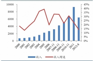 2000-2012年屠宰及肉類加工行業(yè)收入及增:億元