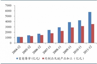2004-2012年屠宰行業(yè)收入及肉制品行業(yè)收入:億元