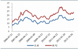本文導(dǎo)讀:預(yù)計2013年豬肉價格呈箱體震蕩。2013年1月14日數(shù)據(jù)顯示,生豬平均價格達(dá)到17.38元/公斤,能繁母豬存欄量達(dá)到2009年以來高峰,2012年11月達(dá)到5062萬頭,預(yù)計2013年上半年豬肉價格將所回落。