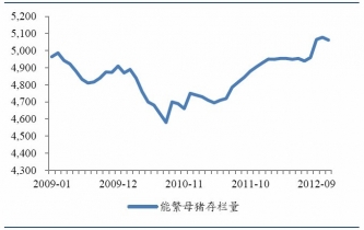 2009-2012年我國能繁母豬存欄量(萬頭)