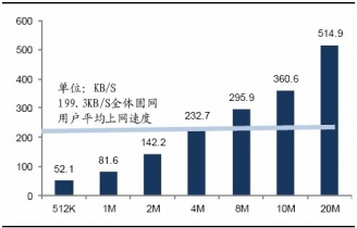 從需求面來看,全民上網的高潮,網絡視頻、網絡音樂、網絡游戲、即時通訊及微博等工具被廣泛使用,用戶對網絡速度的渴求達到了前所未有的高度。但目前中國寬帶通信呈現(xiàn)低寬帶低覆蓋率的雙低格局,可提供的網絡接入帶寬平均在2-4M左右,就在如此低速的情況下,大多數(shù)用戶使用的卻是假帶寬(假寬帶即網民使用的實際寬帶下載速率低于運營商提供的名義寬帶速率),全國固網寬帶用戶平均上網速度為199.3KB每秒,與名義速度差異極大。