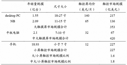 本文導(dǎo)讀:大屏觸控市場顯著大于小屏市常以目前手機(jī)與PC的年銷售量來測算(智能化過程中,大屏觸控(包括臺(tái)式PC與NB)市場規(guī)模約353億美元,為小屏觸控市場規(guī)模的1.6倍。