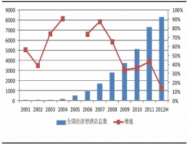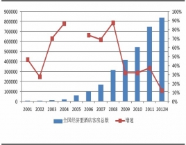2001-2012年中國經(jīng)濟型酒店總數(shù)與增速