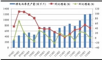 2009-2012年我國鋰電池季度產(chǎn)量及增速