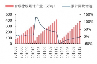 2010-2012年國(guó)內(nèi)合成橡膠產(chǎn)量增速回升