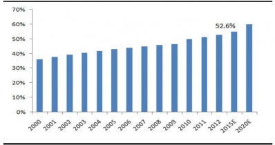 在2011 年末,我國城市化率首次超過50%達(dá)到51.27%,表明我國城市化進(jìn)程取得重大突破。總體來看,我國目前已處于城市化中后期,除滿足新移民到城市的人口的居住需求外,更要適應(yīng)城市居民快速興起的商業(yè)、社會(huì)活動(dòng)需求增加以及改善住宅品質(zhì)的意愿,我們預(yù)計(jì)2020 年城市化率將超過60%。因此,我國城市住宅、公共建筑、商業(yè)用地以及新農(nóng)村建設(shè)和保障房建設(shè)發(fā)展仍具備加速度,這將繼續(xù)保持對建筑防水材料需求的增長。