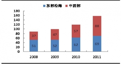 在經(jīng)濟(jì)發(fā)展相對落后的中西部地區(qū)由于高檔新型建筑防水材料的價(jià)格相對較高,以瀝青復(fù)合胎柔性卷材為主的瀝青油氈類防水卷材仍占據(jù)較大的市場份額,但我們認(rèn)為這種格局正在逐步改變,中西部地區(qū)將是未來的主要增長點(diǎn)。近幾年,我國中西部GDP 超千億的城市快速增加,增速遠(yuǎn)高于東部沿海地區(qū),至2011 年底,中西部GDP 超千億城市共計(jì)88 個(gè),東部沿海為69 個(gè)。同時(shí),二、三線城市GDP 過去5 年的復(fù)合增長率也明顯高于北京、上海、廣州和深圳等一線城市。但從城市化率水平來看,中西部地區(qū)仍然較低,至2011 年底,中部地區(qū)城市化率為47%,西部地區(qū)為43%。而東部地區(qū)已經(jīng)達(dá)到61%,因此中西部地區(qū)仍然具備較大的增長空間,也是未來的主要增長點(diǎn)。