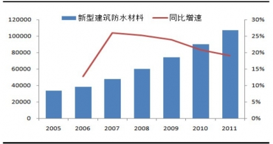 2005-2011年新型建筑防水材料產量及增速:萬平方米