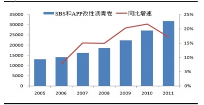 2005-2011年中國SBS 和APP 改性瀝青卷產量及增速:萬平方米