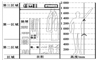 第一區(qū)域?yàn)橐匀思鐬檩S,上肢半徑活動(dòng)的范圍,高度定在600~1 800mm,是存取物品最方便、使用頻率最多的區(qū)域,也是人的視線最易看到的視域。