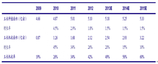 玉米機(jī)收率與小麥(90%以上)、水稻(近70%)等作物相比,仍然明顯偏低,具有較大提升空間。考慮到未來(lái)幾年城鎮(zhèn)化和農(nóng)業(yè)現(xiàn)代化的推進(jìn),農(nóng)村勞動(dòng)力緊缺加劇和人力成本的快速上漲,我們預(yù)計(jì)玉米機(jī)需求將保持快速增長(zhǎng),到2015年玉米機(jī)收率將提升至60%左右。