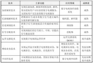 數(shù)字電視軟硬件涉及的技術(shù)廣泛,主要包括信源編解碼技術(shù)、加密解密技術(shù)、信道調(diào)制技術(shù)、信號(hào)分配技術(shù)、運(yùn)營(yíng)支撐技術(shù)、數(shù)字電視增值業(yè)務(wù)技術(shù)、中間件技術(shù)等。各項(xiàng)技術(shù)的功能、應(yīng)用領(lǐng)域和成熟程度如下表所示:
