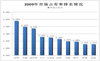 以2009 年為例,前5 名企業(yè)的市場(chǎng)份額之和占到整個(gè)市場(chǎng)的17.48%,前10 名企業(yè)占到了26.65%。具體情況詳見(jiàn)下圖: