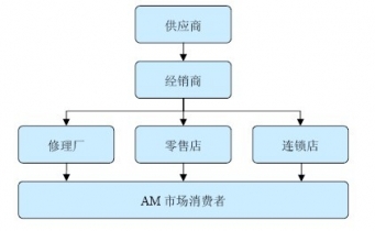 AM 市場屬于零售市場,產(chǎn)品主要通過專業(yè)修理廠、連鎖店、零售店等銷售給消費者。AM 市場與地區(qū)的地理環(huán)境以及汽車保有量有較大聯(lián)系。AM 市場的特點決定了其產(chǎn)品需求以多品種、小批量為主,地域差別較大,市場集中度低。AM 市場的參與者結(jié)構(gòu)如下圖所示: