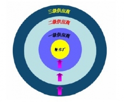 我國汽車零部件行業(yè)主機配套市場已經(jīng)形成一個近似箭靶的多層級供應(yīng)商體系。靶心為整車生產(chǎn)企業(yè),靶心向外依次為:第一環(huán)為具有產(chǎn)品開發(fā)能力的一級供應(yīng)商,一般是總成系統(tǒng)、模塊供應(yīng)商;第二環(huán)為二級供應(yīng)商,服務(wù)于一級供應(yīng)商的分總成的供應(yīng)商;第三環(huán)是三級供應(yīng)商,主要提供標(biāo)準(zhǔn)件,按照具體部件或者工藝流程分工協(xié)作。